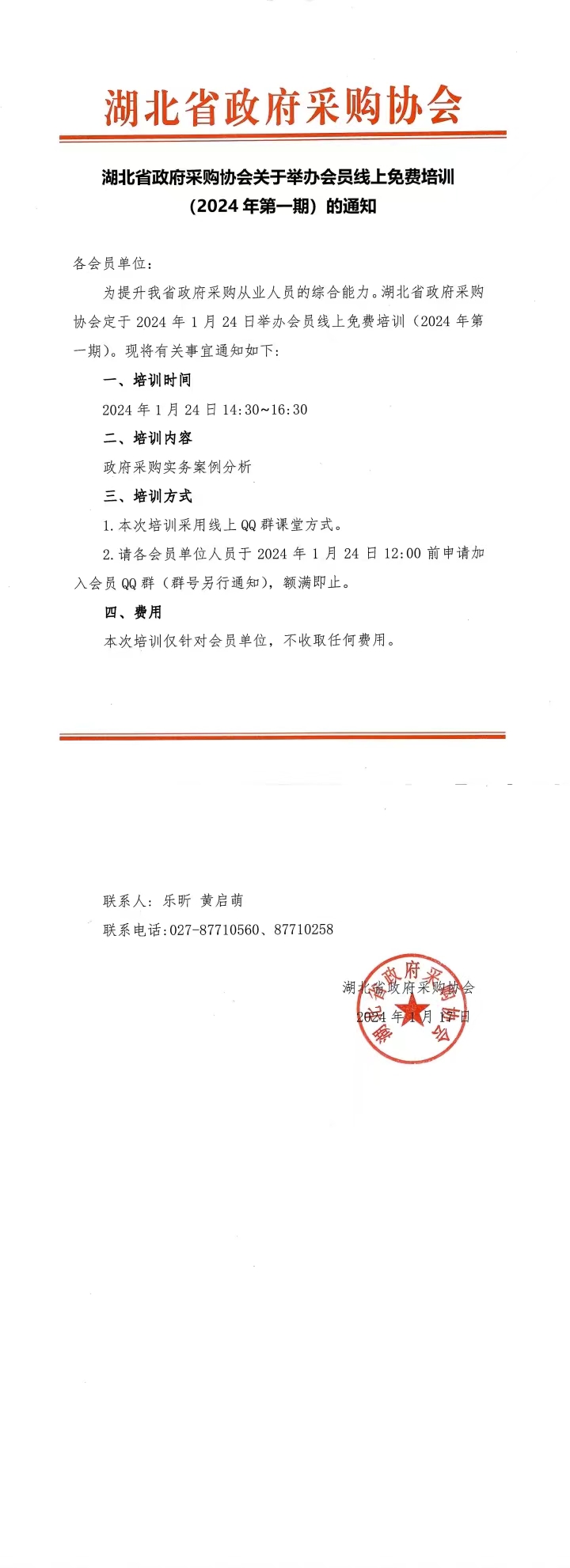 湖北省政府采购协会关于举办会员线上免费培训(2024年第一期)的通知