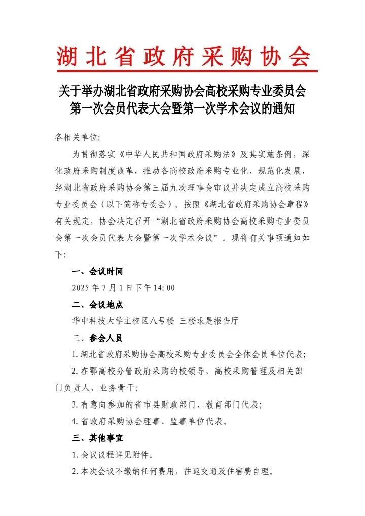 关于举办湖北省政府采购协会高校采购专业委员会 第一次会员代表大会暨第一次学术会议的通知